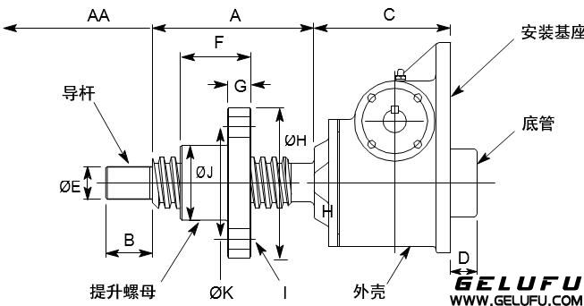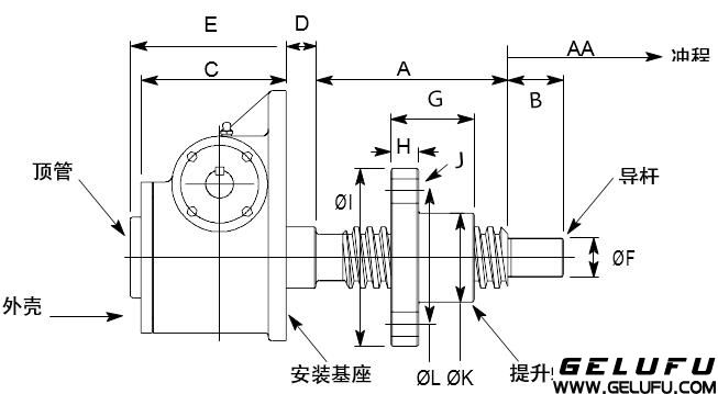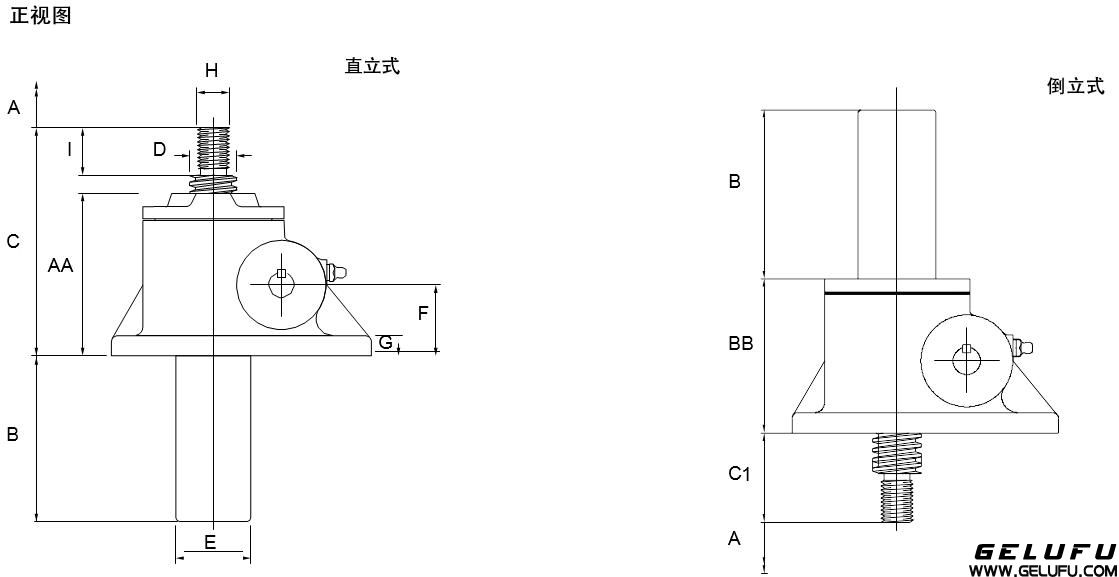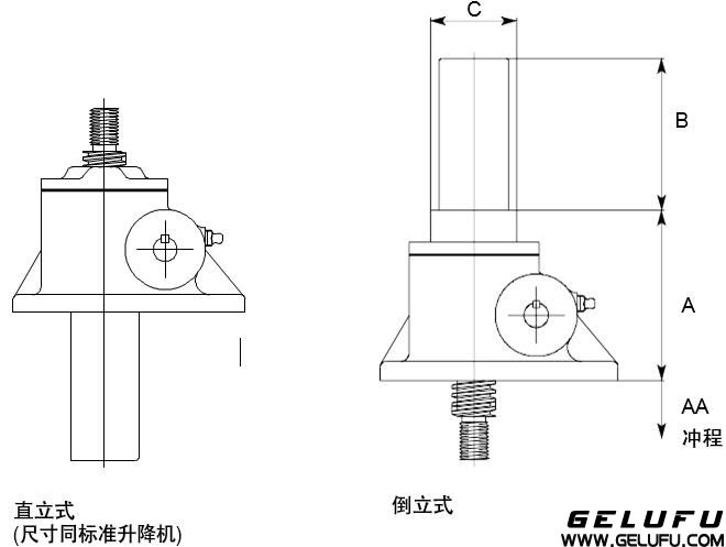 螺紋端和法蘭端的升降機(jī),直立式和倒立式收縮尺寸相同。 螺母運(yùn)動(dòng)式升降機(jī)(參考1.3)的外殼尺寸與絲桿運(yùn)動(dòng)式的升降機(jī)相同。 尺寸如有變更,恕不另行通知。