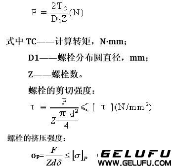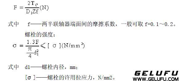 [T]——螺栓材料的許用剪應(yīng)力,載荷穩(wěn)定時,可取[T]=0.4σS,載荷變化時,可取[T]=(0.2~0.25)σS,σS為螺栓材料的屈服極限; [σ]P——許用擠壓應(yīng)力,N/mm2,載荷穩(wěn)定時,對鋼可取[σ]P=(0.8~1)σS,對鑄鐵可取[σ]P=0.8[σ]b;載荷變化時,對鋼可取[σ]P=(0.5~0.65)[σ]S;對鑄鐵可取[σ]P=0.5[σ]b,其中[σ]b為材料的拉伸強(qiáng)度極限。 普通螺栓聯(lián)接,裝配時須擰緊螺栓,靠兩半聯(lián)軸器端面之間發(fā)生的摩擦力傳遞轉(zhuǎn)矩,每一螺栓的預(yù)緊力為: