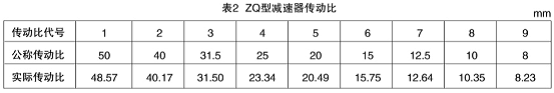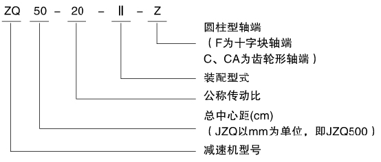 標(biāo)記示例:ZQ型減速機(jī)總中心距為50cm,遭比i=40.17,第Ⅱ種裝配型式,輸出軸為CA齒輪型,標(biāo)記為:減速機(jī)ZQ 50-40-Ⅱ-CA