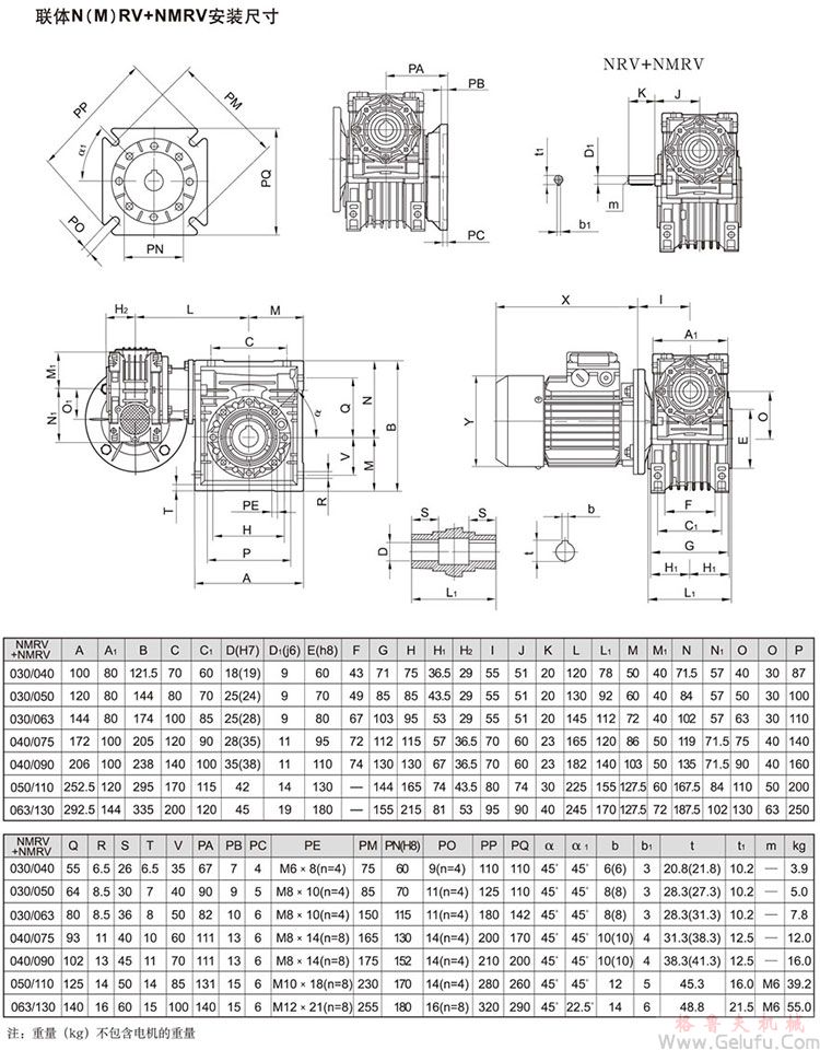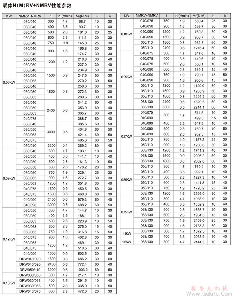 RV鋁合金微型蝸桿減速機(jī)雙級組合性能參數(shù)表