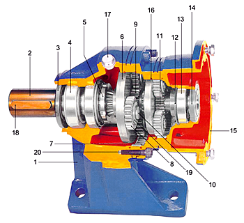 01.減速機(jī)本體Housing 02.出力軸Output Shaft 03.出力軸油封Oil Seal-Output Shaft 04.出力軸承Bearing-Output Shaft 05.太陽(yáng)螺帽Sun Nut 06.游星架Planetary Carrier 07.內(nèi)齒環(huán)Internal Gear Ring 08.游星齒輪Planetary Gear 09.階段齒輪Using Connected Section's Gear 10.滾針軸Needle Roller Pin 11.太陽(yáng)齒輪Sun Gear Input Shaft 12.C型扣環(huán)Snap Ring 13.入力軸承Bearlng-lntpLrt Shaft 14.入力軸油封Oil Seal-Input Shaft 15.人力法蘭Input Ftange 16.O型環(huán)O-Ring 17.透氣塞Breather Plug 18.輸出軸鍵Key-Output Shaft 19.墊圈Washer 20.內(nèi)六角螺絲Hex Socket Cap Screw