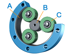 行星式齒輪減速器由一個(gè)內(nèi)齒環(huán)(A)緊密結(jié)合于齒箱殼體上,環(huán)齒中心有一個(gè)自外部動(dòng)力所驅(qū)動(dòng)之太陽(yáng)齒輪(B)介于兩者之間有一組由三顆齒輪等分組合于托盤(pán)上之行星齒輪組(C)該組行星齒輪依靠著出力軸、內(nèi)齒環(huán)及太陽(yáng)齒支撐浮游于期間;當(dāng)入力側(cè)動(dòng)力驅(qū)動(dòng)太陽(yáng)齒時(shí),可帶動(dòng)行星齒輪自轉(zhuǎn),并依循著內(nèi)齒環(huán)之軌跡沿著中心公轉(zhuǎn),行星之旋轉(zhuǎn)帶動(dòng)連結(jié)于托盤(pán)之出力軸輸出動(dòng)力。