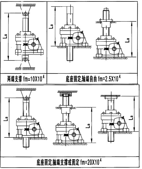 Pcr—絲桿臨界載荷(N) fm—長度系數(詳見附表4) d—絲桿底徑(mm)(詳見附表5)