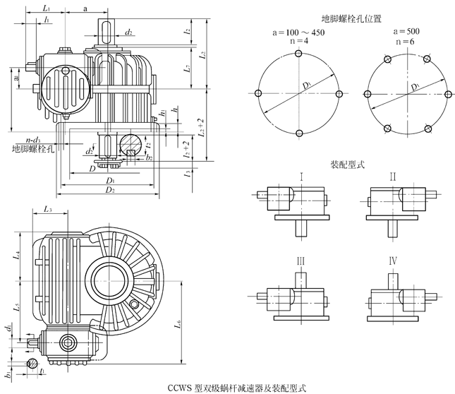CCWS100-CCWS500、型低速級(jí)蝸桿蝸輪之側(cè)的雙級(jí)蝸桿減速機(jī)裝配形式與主要尺寸(JB/T7008-1993)