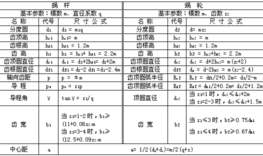 蝸桿蝸輪的主要參數(shù)有:模數(shù)m、蝸桿分度圓直徑d、導(dǎo)程角γ、、中心距a、蝸桿頭數(shù)z1、蝸輪齒數(shù)z2等,根據(jù)上述參數(shù)可決定蝸桿蝸輪的基本尺寸,其中z1、z2由傳動(dòng)要求選定。幾何尺寸計(jì)算如下表所示。