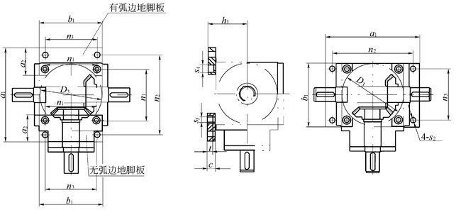SP系列圓錐齒輪換向機(jī)地腳尺寸 帶圓弧地腳板可安裝換向器的任意面,無圓弧地腳板只能安裝在換向器的平坦面