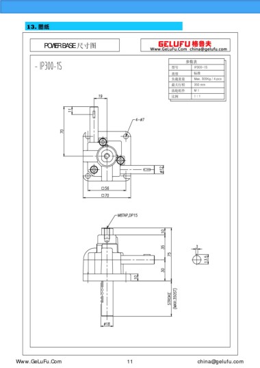 13. 圖紙 POWER BASE 尺寸圖 參數(shù)表 型號 IP300-1S 類型 標(biāo)準(zhǔn) 負(fù)載重量 Max. 300Kg / 4 pcs 最大行程 350 mm 齒輪組件 M 1 比例 1 : 1 www.xuexigo.cn 11 china@gelufu.com