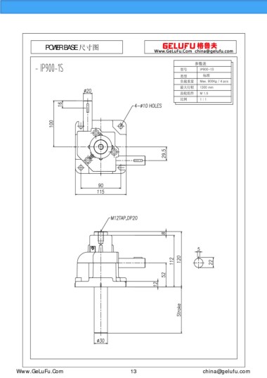POWER BASE 尺寸圖 參數(shù)表 型號 IP900-1S 類型 標(biāo)準(zhǔn) 負載重量 Max. 900Kg / 4 pcs 最大行程 1300 mm 齒輪組件 M 1.5 比例 1 : 1 www.xuexigo.cn 13 china@gelufu.com