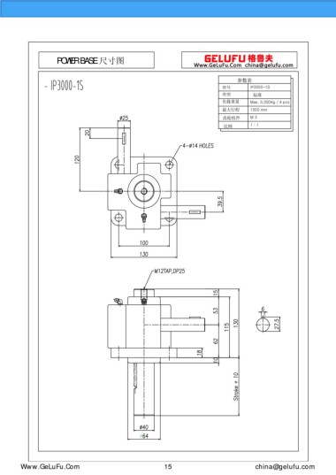 POWER BASE 尺寸圖 參數(shù)表 型號 IP3000-1S 類型 標(biāo)準(zhǔn) 負(fù)載重量 Max. 3,000Kg / 4 pcs 最大行程 1500 mm 齒輪組件 M 3 比例 1 : 1 www.xuexigo.cn 15 china@gelufu.com