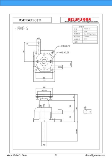 POWER BASE 尺寸圖 參數(shù)表 型號(hào) IP900F-1S 類型 標(biāo)準(zhǔn) 負(fù)載重量 Max. 900Kg / 4 pcs 最大行程 1300 mm 齒輪組件 M 1.5 比例 1 : 1 www.xuexigo.cn 21 china@gelufu.com