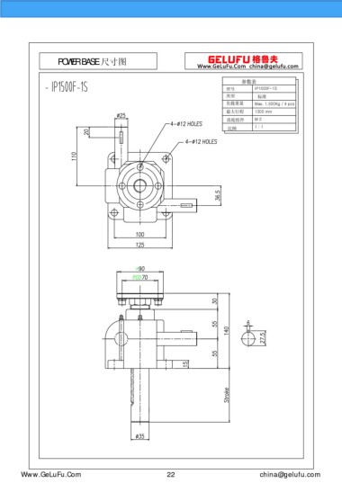 POWER BASE 尺寸圖 參數(shù)表 型號(hào) IP1500F-1S 類型 標(biāo)準(zhǔn) 負(fù)載重量 Max. 1,500Kg / 4 pcs 最大行程 1300 mm 齒輪組件 M 2 比例 1 : 1 www.xuexigo.cn 22 china@gelufu.com