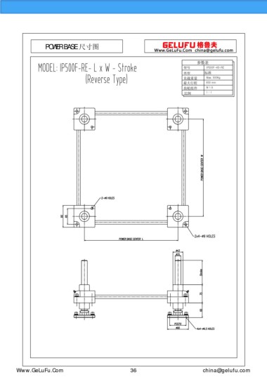 POWER BASE 尺寸圖 參數(shù)表 型號(hào) IP500F-4S-RE 類型 標(biāo)準(zhǔn) 負(fù)載重量 Max. 500Kg 最大行程 600 mm 齒輪組件 M 1.5 比例 1 : 1 www.xuexigo.cn 36 china@gelufu.com