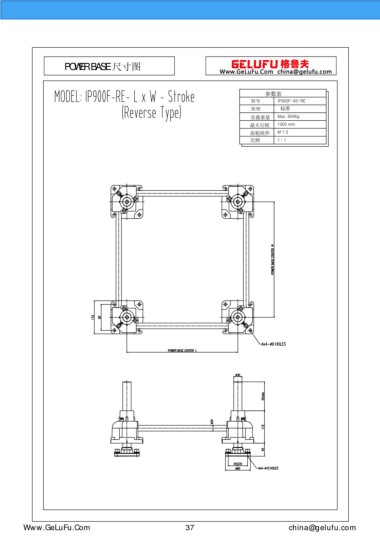 POWER BASE 尺寸圖 參數(shù)表 型號(hào) IP900F-4S-RE 類型 標(biāo)準(zhǔn) 負(fù)載重量 Max. 900Kg 最大行程 1300 mm 齒輪組件 M 1.5 比例 1 : 1 www.xuexigo.cn 37 china@gelufu.com