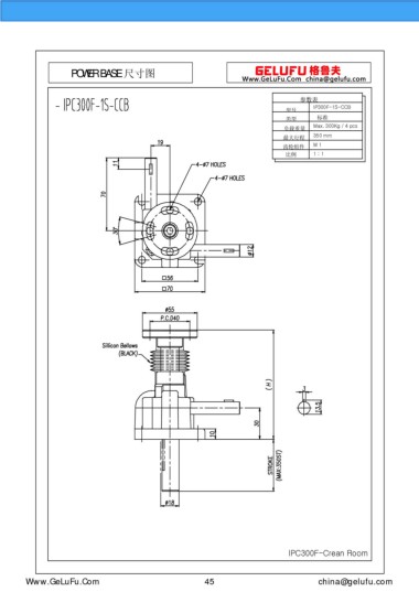 POWER BASE 尺寸圖 參數(shù)表 IP300F-1S-CCB 型號(hào) 類型 標(biāo)準(zhǔn) Max. 300Kg / 4 pcs 負(fù)載重量 最大行程 350 mm 齒輪組件 M 1 比例 1 : 1 IPC300F-Crean Room www.xuexigo.cn 45 china@gelufu.com