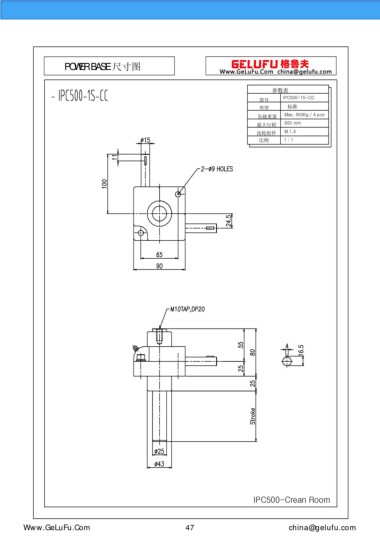 POWER BASE 尺寸圖 參數(shù)表 IPC500-1S-CC 型號 類型 標準 負載重量 Max. 500Kg / 4 pcs 最大行程 600 mm 齒輪組件 M 1.5 比例 1 : 1 IPC500-Crean Room www.xuexigo.cn 47 china@gelufu.com