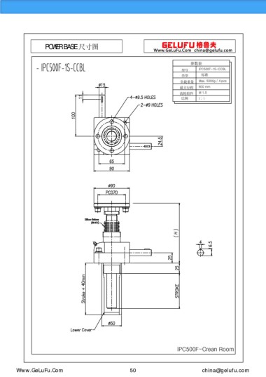 POWER BASE 尺寸圖 參數(shù)表 型號(hào) IPC500F-1S-CCBL 類型 標(biāo)準(zhǔn) 負(fù)載重量 Max. 500Kg / 4 pcs 最大行程 600 mm 齒輪組件 M 1.5 比例 1 : 1 IPC500F-Crean Room www.xuexigo.cn 50 china@gelufu.com