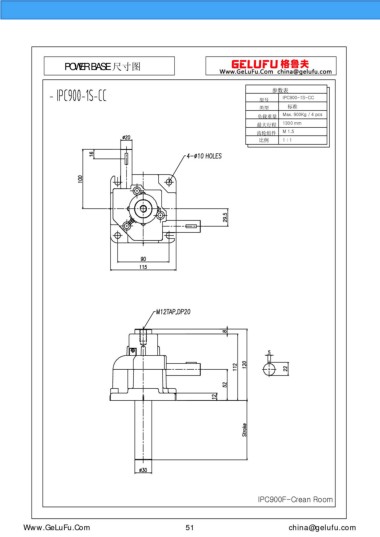 POWER BASE 尺寸圖 參數(shù)表 IPC900-1S-CC 型號(hào) 類(lèi)型 標(biāo)準(zhǔn) 負(fù)載重量 Max. 900Kg / 4 pcs 最大行程 1300 mm 齒輪組件 M 1.5 比例 1 : 1 IPC900F-Crean Room www.xuexigo.cn 51 china@gelufu.com