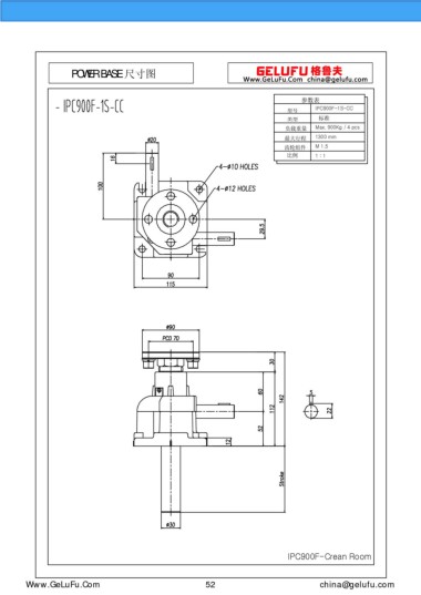 POWER BASE 尺寸圖 參數(shù)表 IPC900F-1S-CC 型號 類型 標準 負載重量 Max. 900Kg / 4 pcs 最大行程 1300 mm 齒輪組件 M 1.5 比例 1 : 1 IPC900F-Crean Room www.xuexigo.cn 52 china@gelufu.com