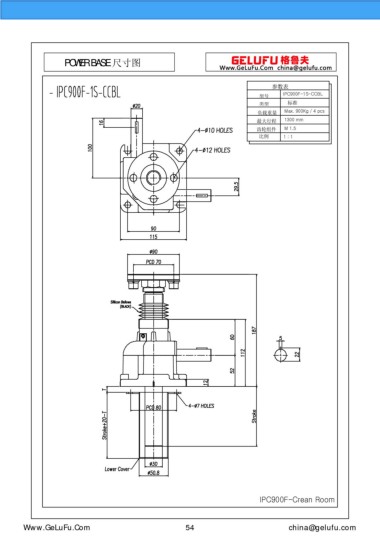 POWER BASE 尺寸圖 參數(shù)表 IPC900F-1S-CCBL 型號(hào) 類型 標(biāo)準(zhǔn) 負(fù)載重量 Max. 900Kg / 4 pcs 最大行程 1300 mm 齒輪組件 M 1.5 1 比例 : 1 IPC900F-Crean Room www.xuexigo.cn 54 china@gelufu.com