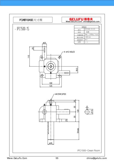 POWER BASE 尺寸圖 參數(shù)表 IPC1500-1S-CC 型號 類型 標準 負載重量 Max. 1,500Kg / 4 pcs 最大行程 1300 mm 齒輪組件 M 2 比例 1 : 1 IPC1500-Crean Room www.xuexigo.cn 55 china@gelufu.com