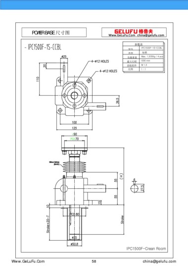 POWER BASE 尺寸圖 參數(shù)表 IPC1500F-1S-CCBL 型號 類型 標(biāo)準(zhǔn) 負(fù)載重量 Max. 1,500Kg / 4 pcs 最大行程 1300 mm 齒輪組件 M 1.5 比例 1 : 1 IPC1500F-Crean Room www.xuexigo.cn 58 china@gelufu.com