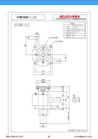 POWER BASE 尺寸圖 參數(shù)表 型號 IPC5000F-1S-CC 類型 標準 Max. 5,000Kg / 4 pcs 負載重量 最大行程 1500 mm 齒輪組件 M 3 比例 1 : 1 IPC5000F-Crean Room www.xuexigo.cn 63 china@gelufu.com