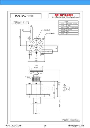POWER BASE 尺寸圖 參數(shù)表 型號(hào) IPC5000F-1S-CCB 類型 標(biāo)準(zhǔn) 負(fù)載重量 Max. 5,000Kg / 4 pcs 最大行程 1500 mm 齒輪組件 M 3 比例 1 : 1 IPC5000F-Crean Room www.xuexigo.cn 64 china@gelufu.com