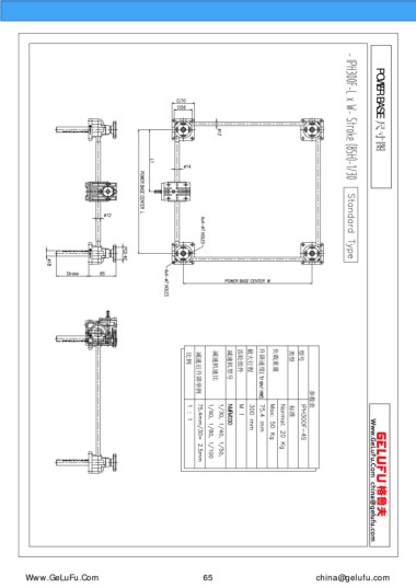 POWER BASE 尺寸圖 標(biāo)準(zhǔn) NMRV030 www.xuexigo.cn 比例 減速后升降舉例 65 減速機(jī)速比 減速機(jī)型號(hào) 齒輪組件 最大行程 升降速度(1rev/mm) 負(fù)載重量 類型 型號(hào) 參數(shù)表 china@gelufu.com