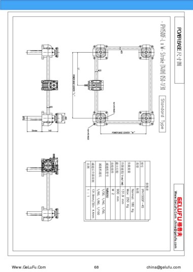 BASE 尺寸圖 比例 減速后升降舉例 減速機速比 減速機型號 齒輪組件 最大行程 升降速度(1rev/mm) 負載重量 類型 型號 參數(shù)表 POWER 標準 NMRV050 www.xuexigo.cn 68 china@gelufu.com