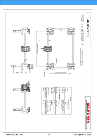 POWER BASE 尺寸圖 減速機速比 標準 NMRV063 www.xuexigo.cn 比例 減速后升降舉例 70 減速機型號 齒輪組件 最大行程 升降速度(1rev/mm) 負載重量 類型 型號 參數(shù)表 china@gelufu.com